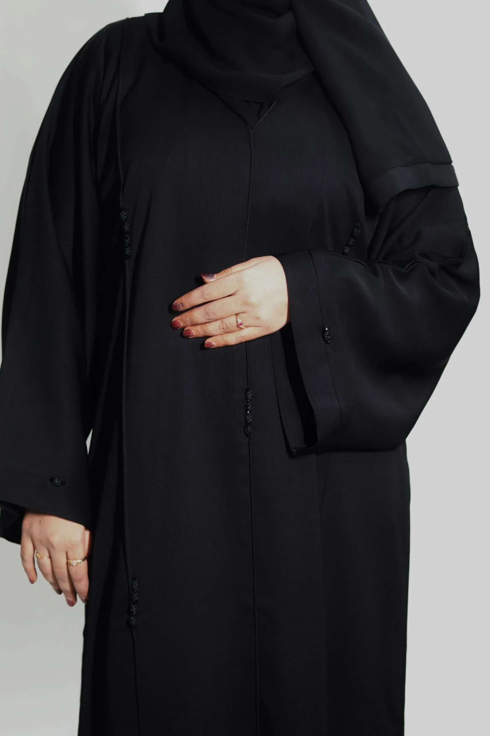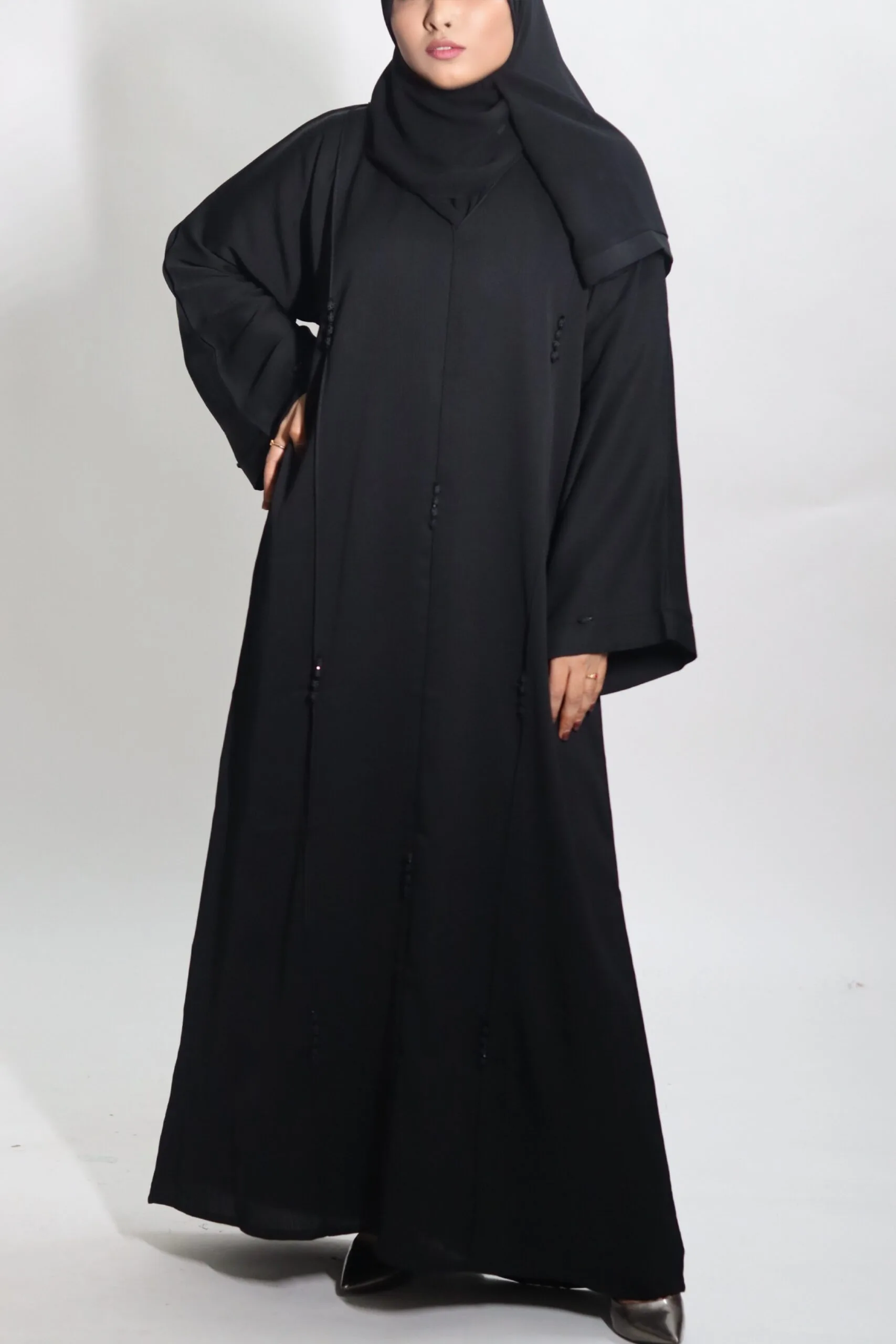 This classic piece is an exemplification of everything you need an every day abaya. The Seher Classic Emirati Abaya in black is masterfully crafted out of premium zoom fabric, and comes with a gorgeous inlayed beadwork across the length. With a beautiful texture and an incredible flow, this abaya is perfect for everyday wear without being too basic! Comes with a matching scarf.