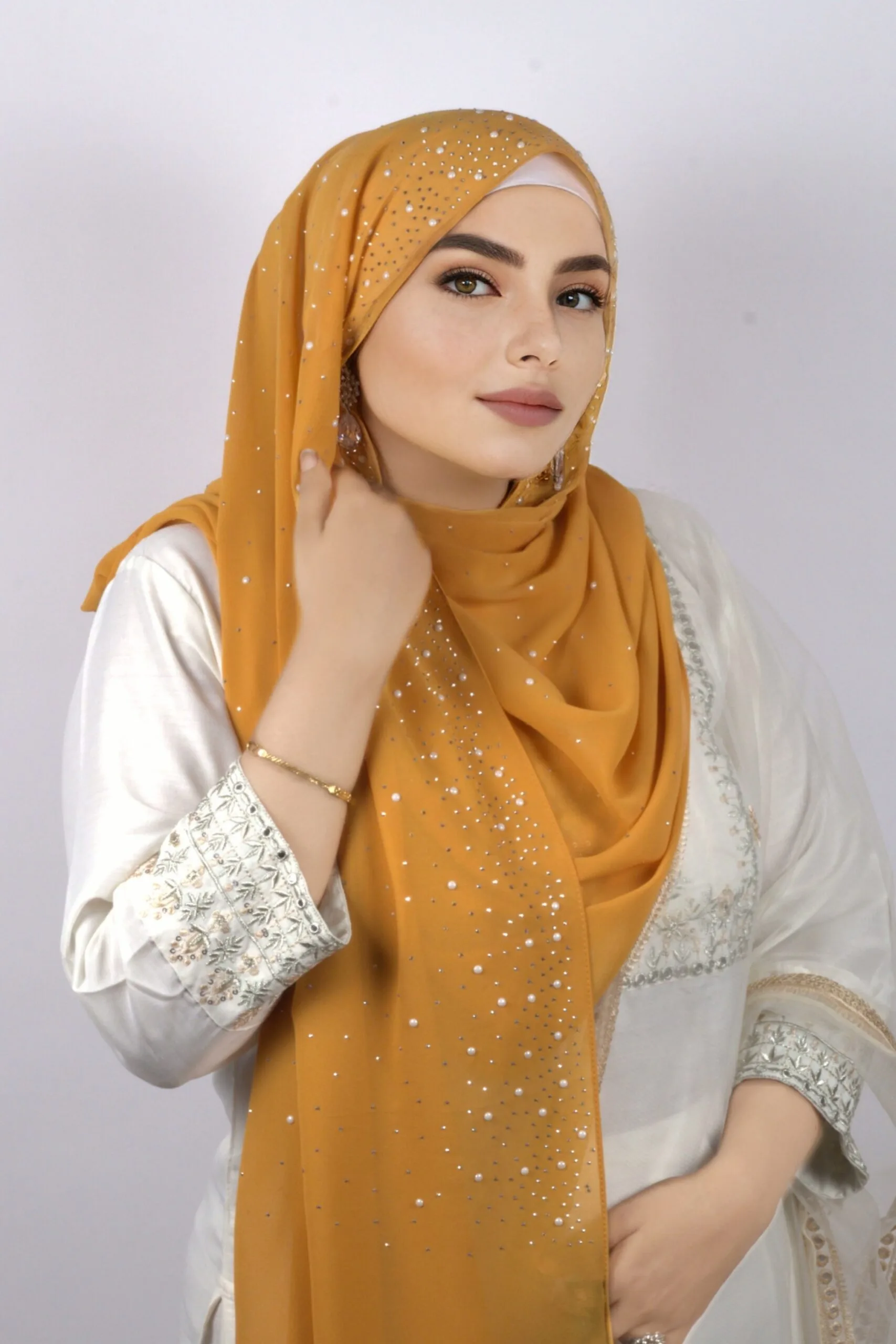 The stunning new moon drop hijab collection is inspired by the night sky, and is studded with an array of pearly white beads denoting the moon and small sparkling stones that encompass the aura of the stars. The hijab comes with pearl and stone embellishments across the length and is spread throughout the hijab. The heavy textured, premium chiffon fabric drapes effortlessly and makes styling easy.