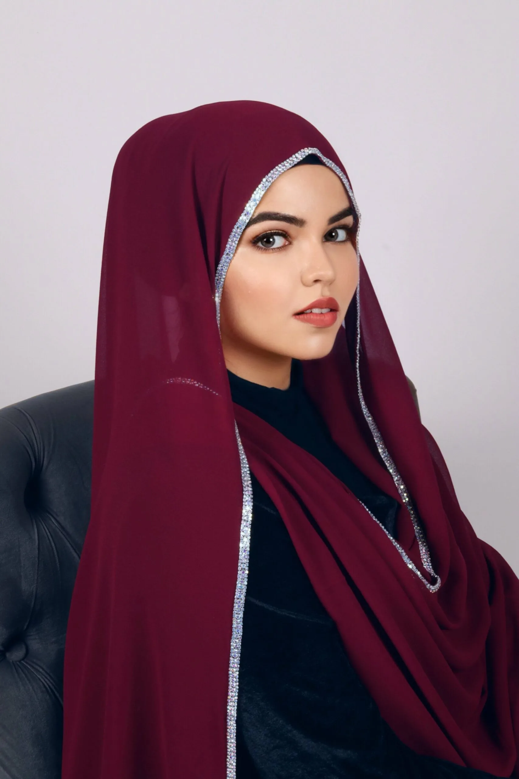 'Bring on the bling, but keep it minimal, classy, and elegant' - we heard you! Our exquisite Crystal Hijab collection is crafted to add a touch of elegance and sophistication to your ensemble. Made from premium-quality chiffon fabric, the hijabs feature sparkling crystal embellishments that are sewn along the edge. This stunning masterpiece can elevate any look, making it perfect for those days when you want to feel extraordinary.