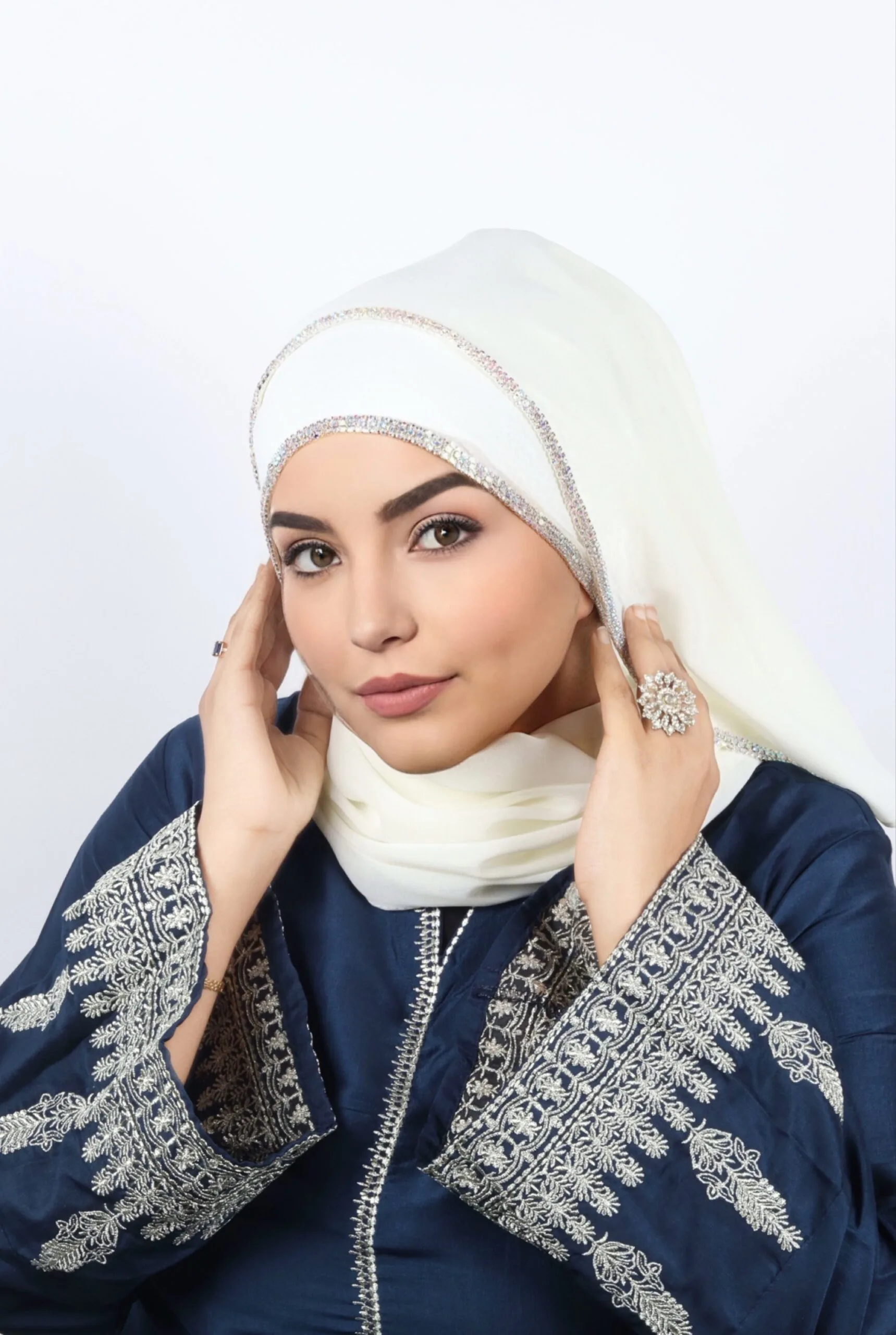 'Bring on the bling, but keep it minimal, classy, and elegant' - we heard you! Our exquisite Crystal Hijab collection is crafted to add a touch of elegance and sophistication to your ensemble. Made from premium-quality chiffon fabric, the hijabs feature sparkling crystal embellishments that are sewn along the edge. This stunning masterpiece can elevate any look, making it perfect for those days when you want to feel extraordinary.