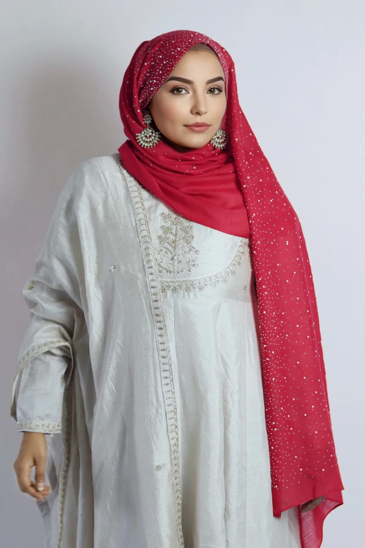 The supreme comfort and versatility of our Classic Cotton Hijabs – now in a new avatar. Expertly crafted from 100% combed cotton, Cotton Stone Drop hijab collection features exquisite half-pearl and stone embellishments across the length and spread throughout the hijab. Embrace the gentle touch of soft fabric against your skin, enveloping you in unmatched comfort, while the studded beads and stones add a touch of sparkle to your attire. These cotton party hijabs provide ample coverage, making them ideal for various styling preferences and a touch of glam, offering the sophistication required for any special occasion.