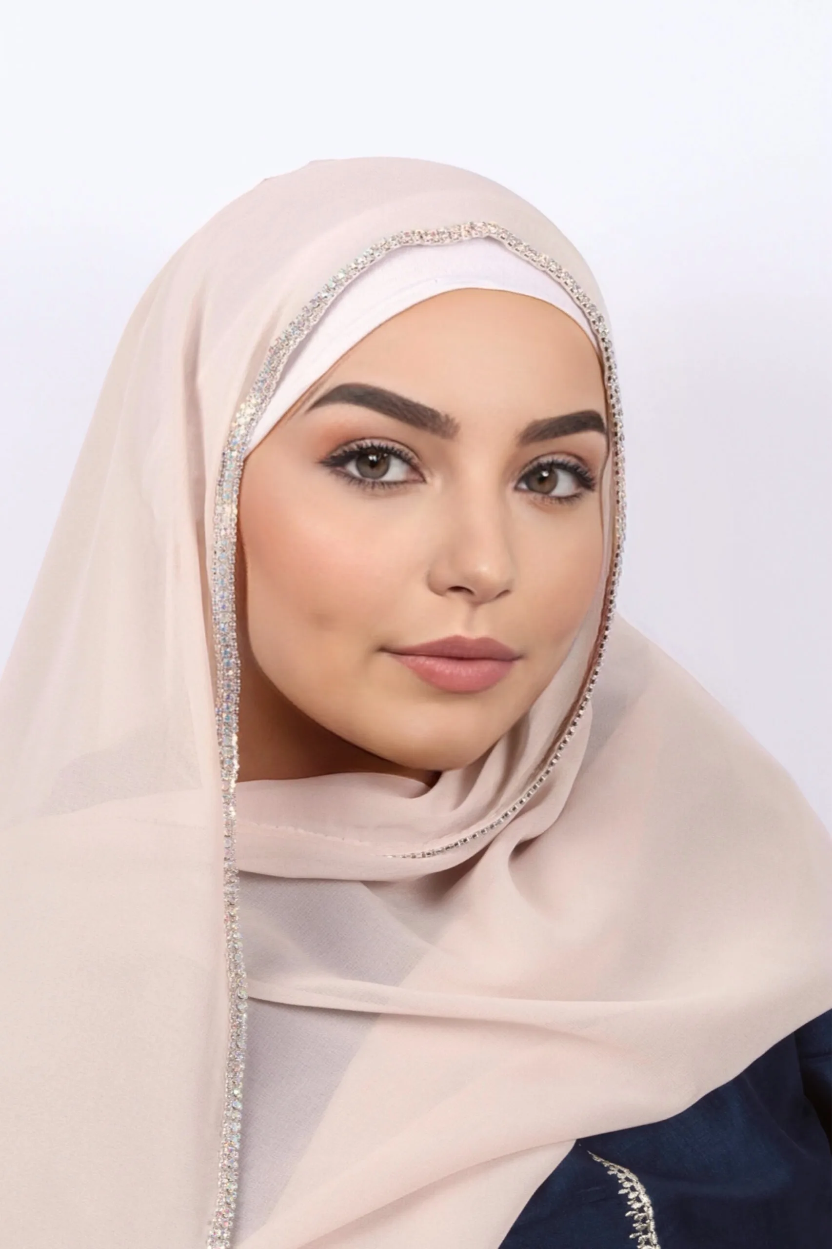 'Bring on the bling, but keep it minimal, classy, and elegant' - we heard you! Our exquisite Crystal Hijab collection is crafted to add a touch of elegance and sophistication to your ensemble. Made from premium-quality chiffon fabric, the hijabs feature sparkling crystal embellishments that are sewn along the edge. This stunning masterpiece can elevate any look, making it perfect for those days when you want to feel extraordinary.