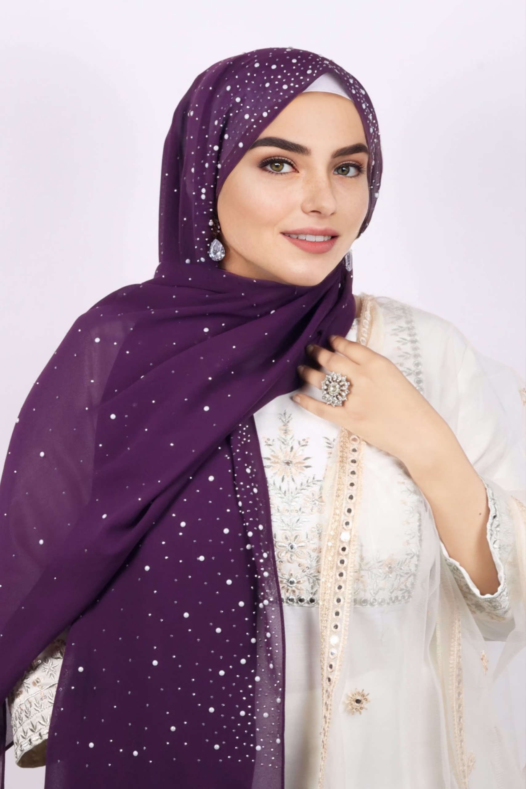 The stunning new moon drop hijab collection is inspired by the night sky, and is studded with an array of pearly white beads denoting the moon and small sparkling stones that encompass the aura of the stars. The hijab comes with pearl and stone embellishments across the length and is spread throughout the hijab. The heavy textured, premium chiffon fabric drapes effortlessly and makes styling easy.