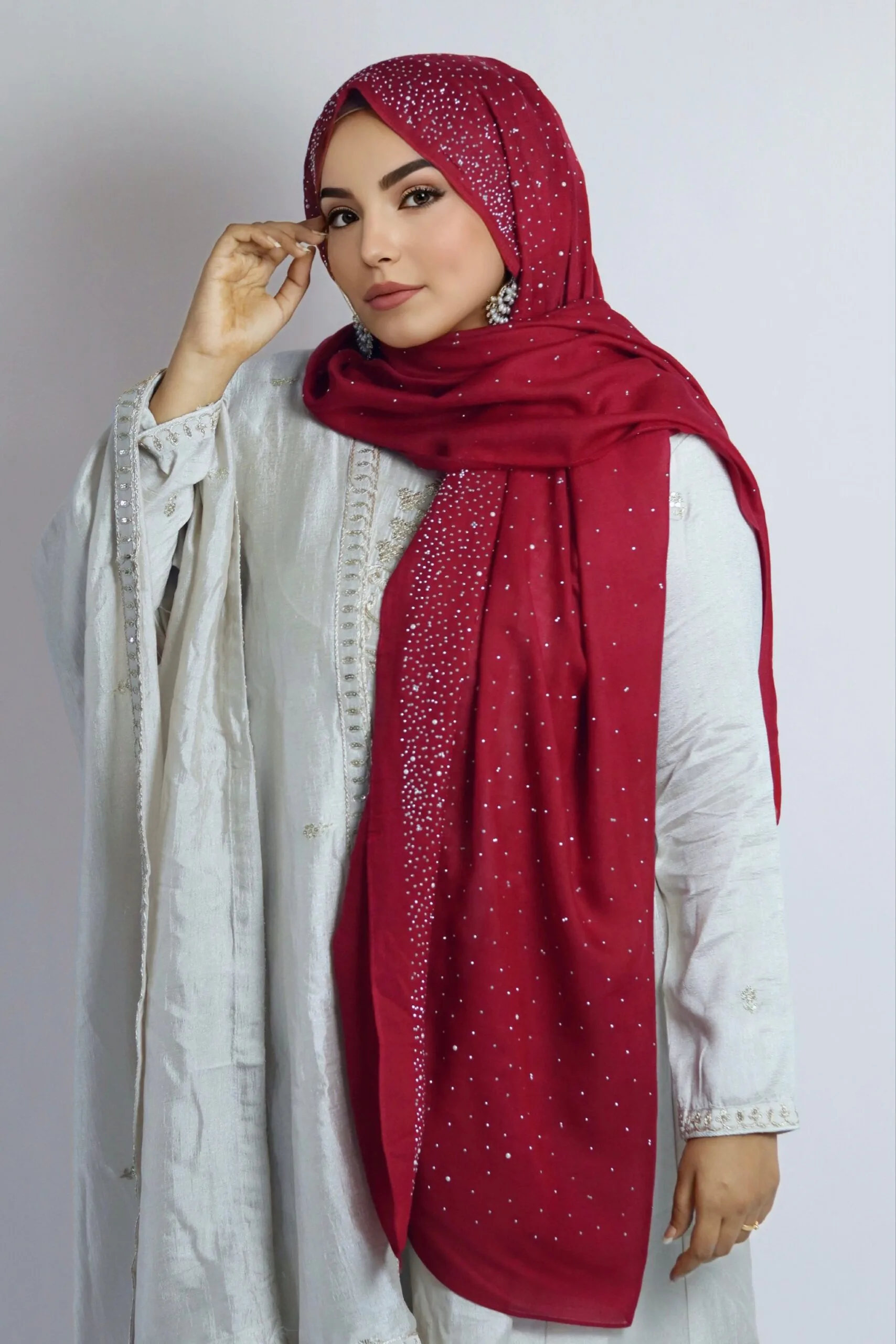 The supreme comfort and versatility of our Classic Cotton Hijabs – now in a new avatar. Expertly crafted from 100% combed cotton, Cotton Stone Drop hijab collection features exquisite half-pearl and stone embellishments across the length and spread throughout the hijab. Embrace the gentle touch of soft fabric against your skin, enveloping you in unmatched comfort, while the studded beads and stones add a touch of sparkle to your attire. These cotton party hijabs provide ample coverage, making them ideal for various styling preferences and a touch of glam, offering the sophistication required for any special occasion.