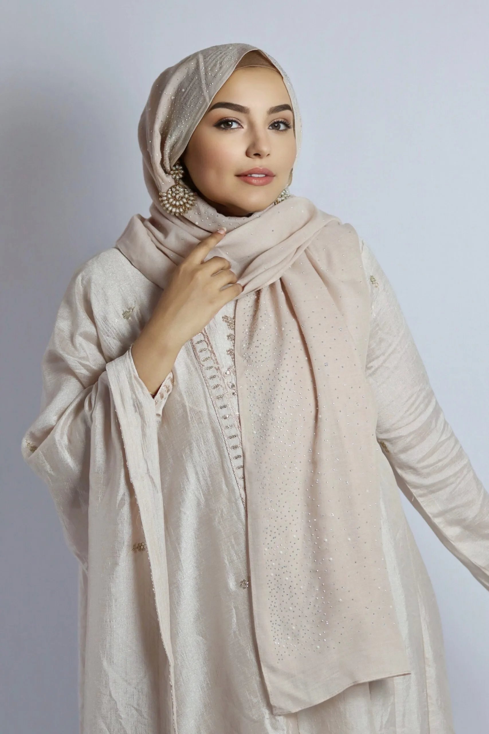 The supreme comfort and versatility of our Classic Cotton Hijabs – now in a new avatar. Expertly crafted from 100% combed cotton, Cotton Stone Drop hijab collection features exquisite half-pearl and stone embellishments across the length and spread throughout the hijab. Embrace the gentle touch of soft fabric against your skin, enveloping you in unmatched comfort, while the studded beads and stones add a touch of sparkle to your attire. These cotton party hijabs provide ample coverage, making them ideal for various styling preferences and a touch of glam, offering the sophistication required for any special occasion.