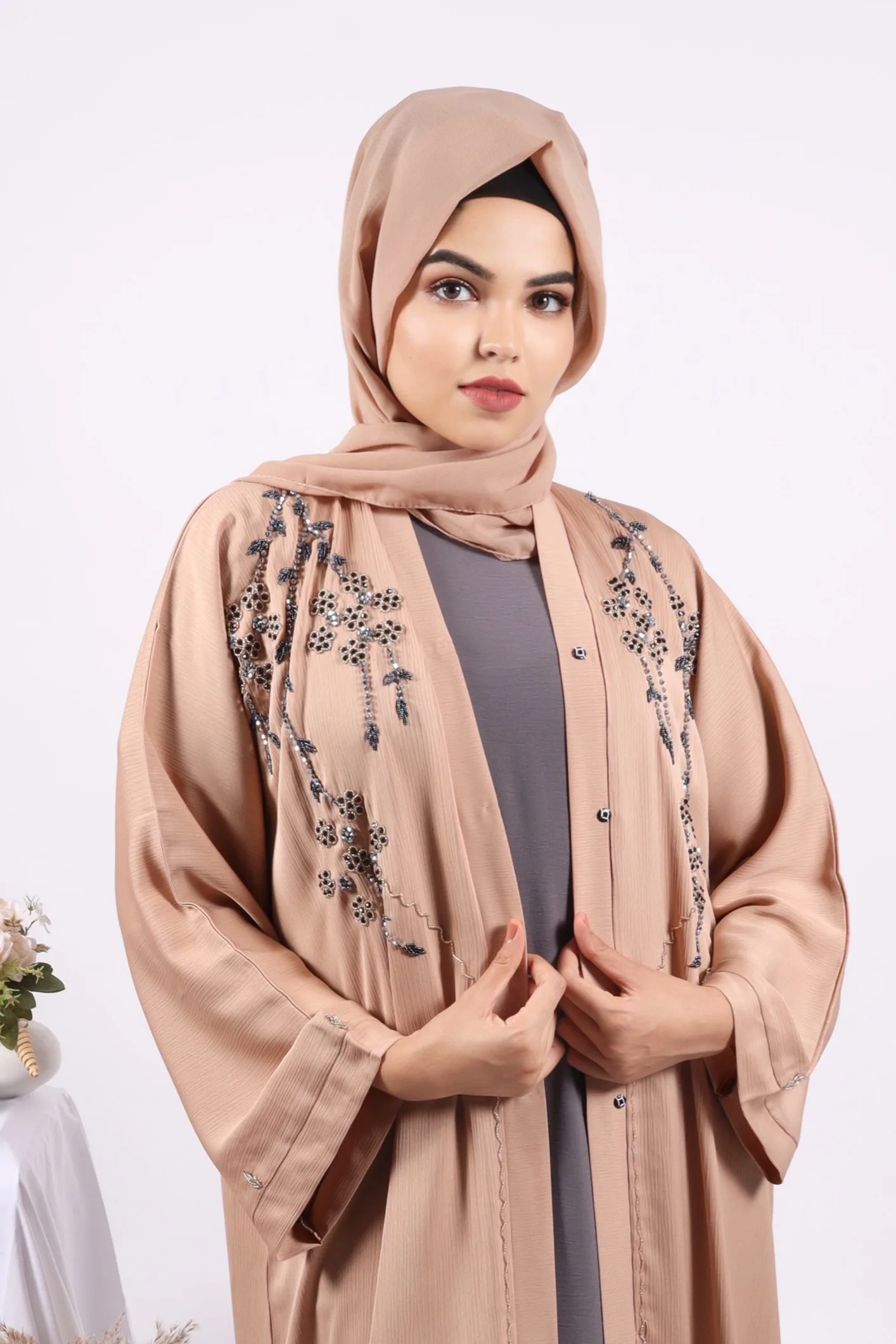Includes: 1 front open abaya, 1 scarf, 1 matching tie belt
