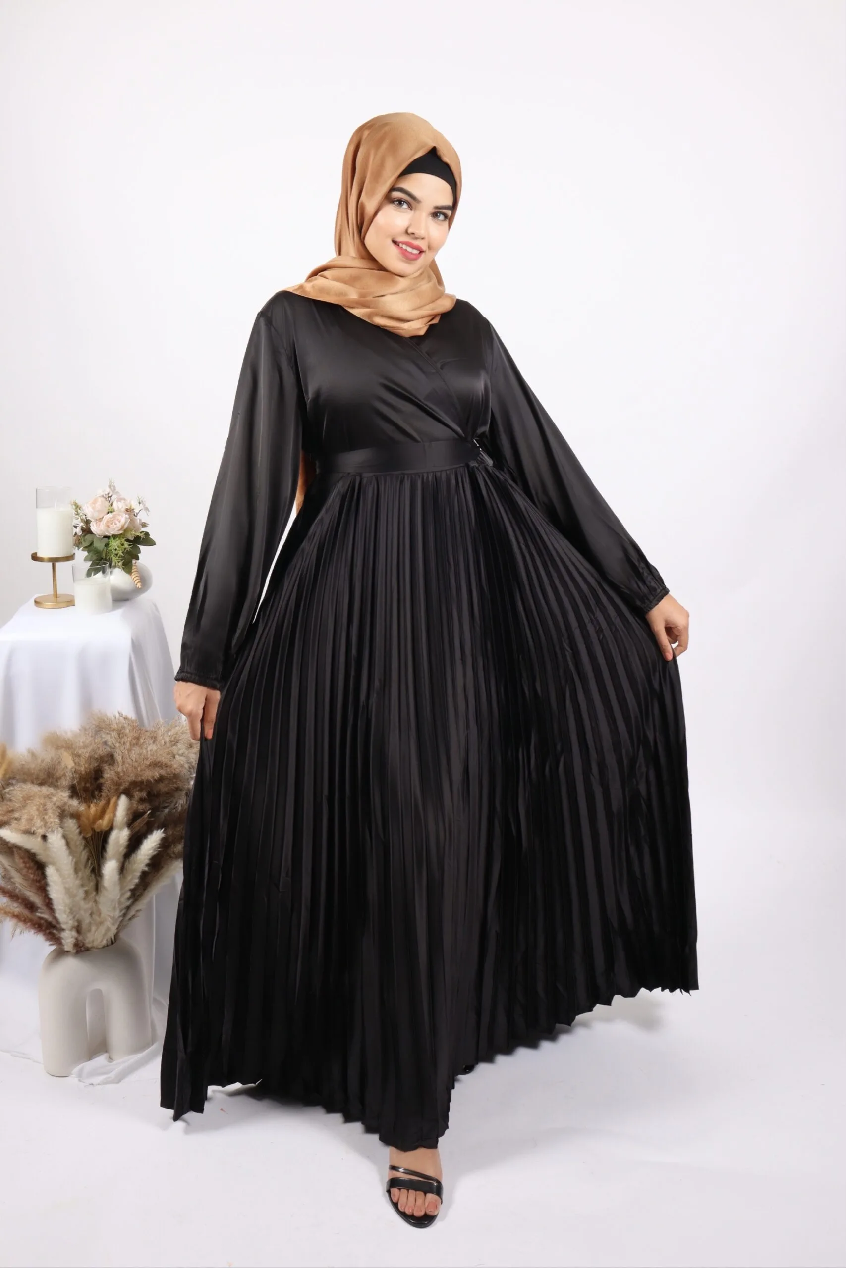 Step into this dress, and step out like a princess! The Siyah Satin Pleated Modest Wear Abaya Dress is a picture of elegance, making it the perfect wedding abaya. The flowy, shiny satin fabric gives it an unmatched feeling of royalty, while the pleated skirt adds a layer of sophistication to this piece. With a wrap around top, wear a covered inner for a more modest look. You can also pair it with earrings or other accessories and get party ready in no time. The satin abaya comes with a matching satin belt to complete the look.