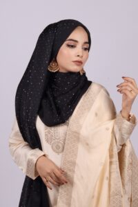 Elevate your modest wardrobe with the Nadira Luxury Kaftan with Black Diamond Trim - Platinum, crafted from premium Harir Masood fabric with a velvety finish. Featuring elegant black diamond trim and a versatile front-open design, it offers both comfort and sophistication. Perfect as occasion wear. Includes matching hijab.