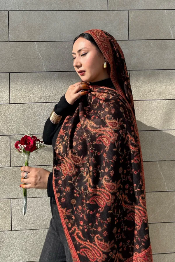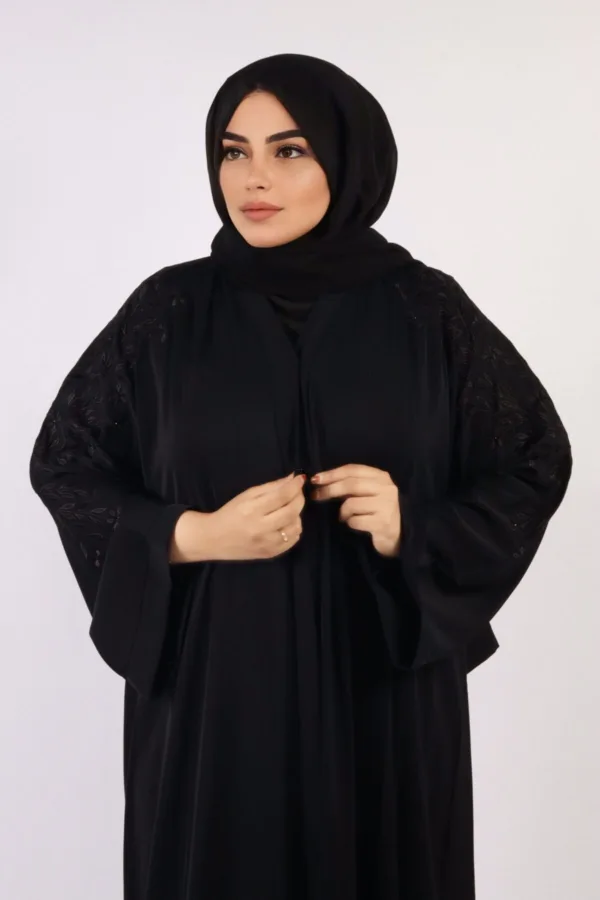 Make a graceful statement with the Marhaba Front Open Arabian Embroidery Abaya - Black. Crafted from silky premium Nusrat fabric, it features elegant embroidery at the back, and sleeves, and studded with stones to add a subtle glam. It has a full frontal button opening, a beautiful flowy cut, and flared sleeves. Includes a matching scarf for a complete, modest look.